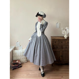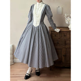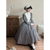 まるで19世紀の淑女のようなノスタルジックなワンピース。クラシカルな雰囲気を漂わせる、ヴィクトリアン調のチェック柄。細やかなモノトーンのギンガムチェック生地に、胸元と袖口のオフホワイト生地がアクセントを添えています。スタンドカラーと連なるボタンが清楚で気品ある印象を演出。ウエストから大きく広がるフレアスカートは、たっぷりとしたドレープで優雅なシルエットを描き、バックスタイルはリボンで結ばれ、後ろ姿まで上品に仕立てられています。