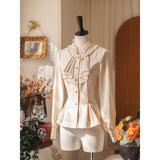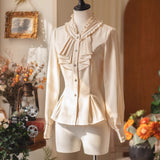 まるで昔の映画のワンシーンから抜け出したようなロマンティックでノスタルジックなブラウス。柔らかなクリーム色が陽だまりのように優しく映えるブラウスは、その存在感で視線を惹きつけます。繊細に寄せられたフリルが首元を包み込み、胸元には二段のタックフリルが流れるようにあしらわれ、クラシカルで気品ある雰囲気を生み出しています。ウエストラインは自然に絞られ、裾に向かってふんわり広がるペプラムのシルエットが、女性らしい優雅さを一層際立たせます。