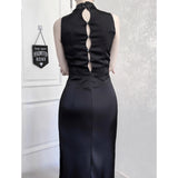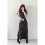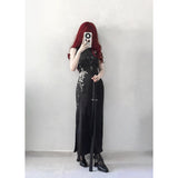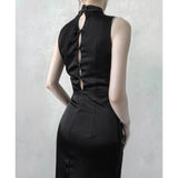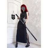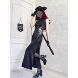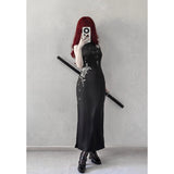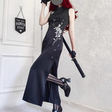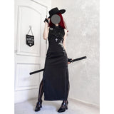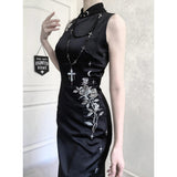 漆黒の夜空に咲いた薔薇を刺繍したチャイナワンピース。月と星、薔薇の花の刺繍が妖しく浮かび上がり、身体のラインを引き立てるスリムシルエット。立ち襟と背面の連なったホールボタンがクラシカルな趣を添え、サイドスリットが動きに艶やかさを与える、ゴシックとエレガンスが融合した一着。