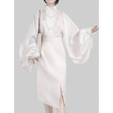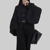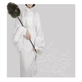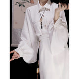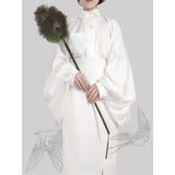 東洋的な優雅さと現代的な洗練を融合させたブラウス。ゆったりとしたシルエットに、流れるようなドレープが肩から袖にかけて美しく広がります。ふんわりとしたバルーンスリーブと、構築的なシルエットが印象的なデザイン。動くたびに柔らかく揺れるフォルムが、優雅さと前衛性を併せ持ったモードなアイテム。