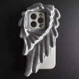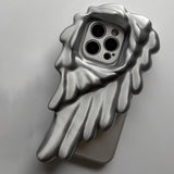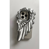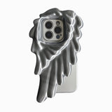 天使の翼をモチーフにしたアートピースのようなiPhoneケース。片側に大きく広がる羽根のデザインが、神秘的で幻想的な雰囲気を演出し、流れるような立体的なフォルムが、彫刻やアート作品のような印象を与えます。