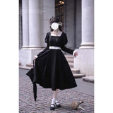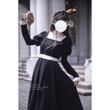 優雅さと軽やかさを併せ持った、ヴィクトリアン調のクラシカルなワンピース。黒を基調にした落ち着いたカラーリングで、肩部分に膨らみを持たせたジュリエットスリーブが気品を漂わせています。スクエアネックに白いフリルをあしらい、首元の装飾が映えるデザイン。ウエストには白いリボンベルトが施され、シルエットを引き締めています。
