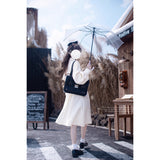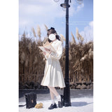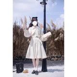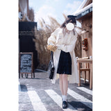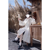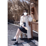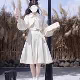 清楚で物語の主人公のような雰囲気を纏うケープトレンチコート。ふんわりと広がるアイボリーの生地に、丸みのある大きな襟と、肩を包み込むように重ねられたケープデザインが印象的。ウエストは共布ベルトで上品に引き締まり、袖はふくらみをもたせたバルーンスリーブで柔らかなシルエットを描き、全体がやさしい光をまとったような純白の世界観に包まれています。