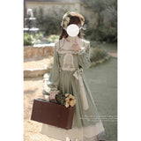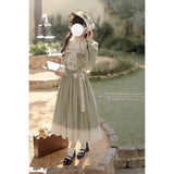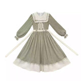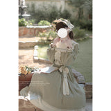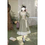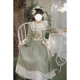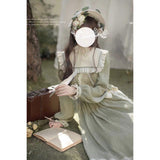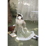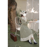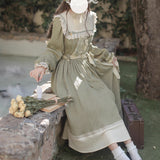 英国庭園の午後を思わせる。柔らかなオリーブグリーンとアイボリーの配色が優しく溶け合う、アンティーク絵本の世界から抜け出してきたようなクラシカルワンピース。繊細なシボ感のある生地が縦に流れ、ふんわりとした長袖と、胸元のスクエアヨークに重ねられたレースやフリルがノスタルジックな表情をつくり、中央にはステンドグラスのような装飾パネルが施されています。ウエストには布花や飾りリボンが丁寧にあしらわれ、裾にはアイボリーの切り替えとレーストリムが優しく広がり、歩くたび物語のページがめくれるように揺れます。