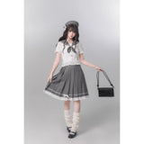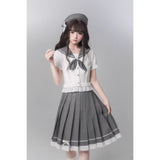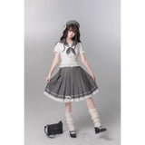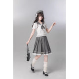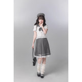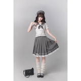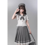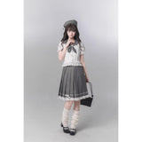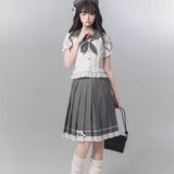 モノトーンの中に甘さを溶かし込んだ、上品でどこか物語性を感じさせるセーラーブラウスとプリーツスカート。やわらかなアイボリーのセーラーブラウスは、透け感のある軽やかな素材に繊細なレースフリルをあしらい、丸みを帯びたセーラーカラーにはグレードットのトリミングが施されています。胸元には同色のドット柄リボンが結ばれており、フロントの小さなボタンやウエスト切り替えのフリルがさりげなく甘さを重ね、清楚さの中にロマンティックなニュアンスを感じさせます。プリーツスカートは落ち着いたチャコールグレーに細かなドットが散りばめられ、端正なプリーツがきれいに広がることでクラシカルなシルエットを描きます。