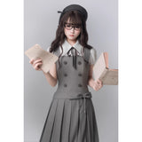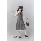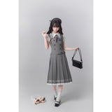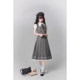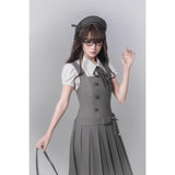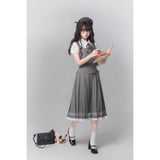 少女らしい可憐さと知的な雰囲気を同時に感じさせるロング丈のジャンパースカートとブラウス。落ち着いたチャコールグレーで仕立てられたジャンパースカートは、上身頃をすっきりと包み込むコンパクトなシルエットにダブルボタンが整然と並び、クラシカルで端正な印象を与えながらも、裾へと続く細かなプリーツが軽やかな広がりを生み出すデザイン。ウエスト脇には小さなリボンと星のチャームがさりげなく揺れ、控えめな甘さを湛えています。裾には繊細なレースが重ねられ、歩くたびにほのかにのぞく白がコントラストを描き、全体をやわらかくまとめ上げています。ブラウスはふんわりと丸みを帯びたパフスリーブと小ぶりな襟元が愛らしく、胸元には細いリボンタイが結ばれて上品なアクセントとなっています。