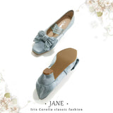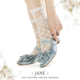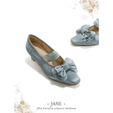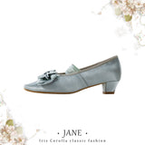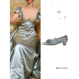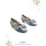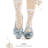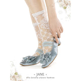 やわらかな光を含んだ、クラシカルでロマンティックなメリージェーンシューズ。丸みを帯びすぎないスクエアトゥに存在感のあるリボンと繊細なレースを重ねた装飾があしらわれ、足元に上品な甘さと物語性を湛えています。控えめな艶とアンティークのような風合いが、どこかヴィンテージドレスを思わせる気品を漂わせています。甲を優しく押さえるストラップはレースの透け感が軽やかさを演出し、まるでクラシックバレエや古い洋館の舞踏会を思わせる、儚くも優雅な足元を完成させてくれる。