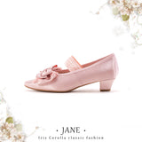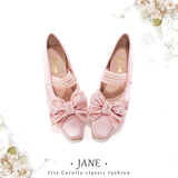 やわらかな光を含んだ、クラシカルでロマンティックなメリージェーンシューズ。丸みを帯びすぎないスクエアトゥに存在感のあるリボンと繊細なレースを重ねた装飾があしらわれ、足元に上品な甘さと物語性を湛えています。控えめな艶とアンティークのような風合いが、どこかヴィンテージドレスを思わせる気品を漂わせています。甲を優しく押さえるストラップはレースの透け感が軽やかさを演出し、まるでクラシックバレエや古い洋館の舞踏会を思わせる、儚くも優雅な足元を完成させてくれる。