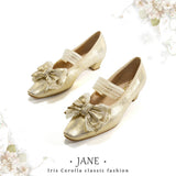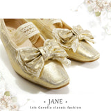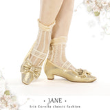 やわらかな光を含んだ、クラシカルでロマンティックなメリージェーンシューズ。丸みを帯びすぎないスクエアトゥに存在感のあるリボンと繊細なレースを重ねた装飾があしらわれ、足元に上品な甘さと物語性を湛えています。控えめな艶とアンティークのような風合いが、どこかヴィンテージドレスを思わせる気品を漂わせています。甲を優しく押さえるストラップはレースの透け感が軽やかさを演出し、まるでクラシックバレエや古い洋館の舞踏会を思わせる、儚くも優雅な足元を完成させてくれる。