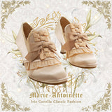 マリー・アントワネットの世界観を纏ったような、ロマンティックでクラシカルなヒールパンプス。丸みを残したスクエアトゥの優雅なフォルムに、幾重にも重ねられたリボンと繊細なレース、つま先を縁取る柔らかなフリルが甘やかな立体感を与えています。フロントには大小のグログランリボンが縦に連なり、その中心を飾る大きなリボンが視線を引き寄せ、可憐さの中に気品を宿しています。履き口にはスカラップ状のレースがあしらわれることで、どの角度から見ても優美な陰影を描きます。ヒールは程よい高さの曲線的なクラシックヒールで、後ろ姿まで抜かりなくエレガントに仕上げられています。