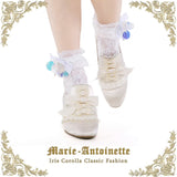マリー・アントワネットの世界観を纏ったような、ロマンティックでクラシカルなヒールパンプス。丸みを残したスクエアトゥの優雅なフォルムに、幾重にも重ねられたリボンと繊細なレース、つま先を縁取る柔らかなフリルが甘やかな立体感を与えています。フロントには大小のグログランリボンが縦に連なり、その中心を飾る大きなリボンが視線を引き寄せ、可憐さの中に気品を宿しています。履き口にはスカラップ状のレースがあしらわれることで、どの角度から見ても優美な陰影を描きます。ヒールは程よい高さの曲線的なクラシックヒールで、後ろ姿まで抜かりなくエレガントに仕上げられています。