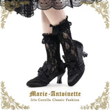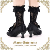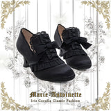 マリー・アントワネットの世界観を纏ったような、ロマンティックでクラシカルなヒールパンプス。丸みを残したスクエアトゥの優雅なフォルムに、幾重にも重ねられたリボンと繊細なレース、つま先を縁取る柔らかなフリルが甘やかな立体感を与えています。フロントには大小のグログランリボンが縦に連なり、その中心を飾る大きなリボンが視線を引き寄せ、可憐さの中に気品を宿しています。履き口にはスカラップ状のレースがあしらわれることで、どの角度から見ても優美な陰影を描きます。ヒールは程よい高さの曲線的なクラシックヒールで、後ろ姿まで抜かりなくエレガントに仕上げられています。