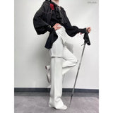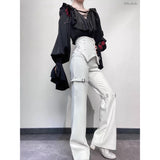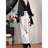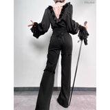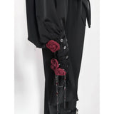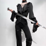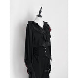 胸元に重なる大胆なフリルとレースアップが視線を惹きつける、退廃的なロマンを纏ったゴシック調のブラウス。しなやかに落ちるとろみ素材が光を柔らかく含みながら身体の動きに合わせて優雅に揺れ、たっぷりと生地を使ったボリュームスリーブは手元でふわりと広がるベルカフスへと続きます。舞台衣装のようなドラマティックな一着。