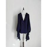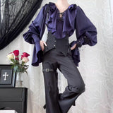 胸元に重なる大胆なフリルとレースアップが視線を惹きつける、退廃的なロマンを纏ったゴシック調のブラウス。しなやかに落ちるとろみ素材が光を柔らかく含みながら身体の動きに合わせて優雅に揺れ、たっぷりと生地を使ったボリュームスリーブは手元でふわりと広がるベルカフスへと続きます。舞台衣装のようなドラマティックな一着。