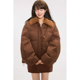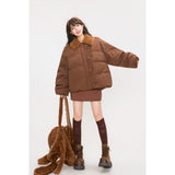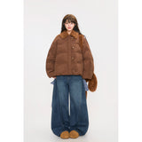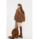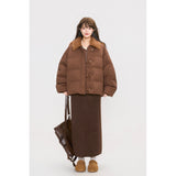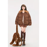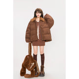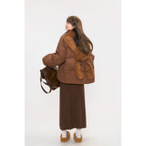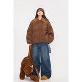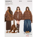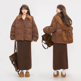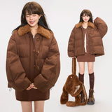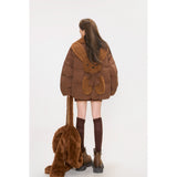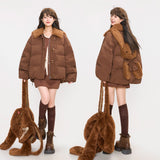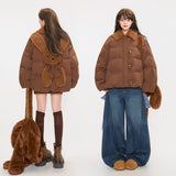 まるでぬいぐるみのような愛らしさとレトロな温もりを融合させたダウンジャケット。ふわふわのボア襟が柔らかな印象を添え、背中には大きなリボンをつけたうさぎさんのモチーフがあしらわれています。丸みを帯びたシルエットと大きなボタンがクラシカルで、どこか懐かしい雰囲気を漂わせながらも、遊び心を忘れない仕上がり。