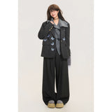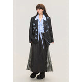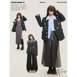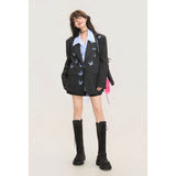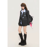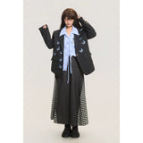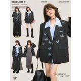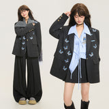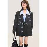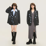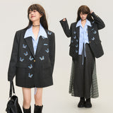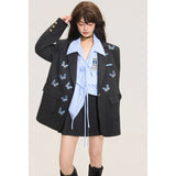 ダークグレー基調にした端正なテーラードシルエットに、全体へ静かに舞うように散りばめられた青い蝶々の刺繍が印象的なジャケット。構築的な肩線と程よくオーバーサイズなバランスがメンズライクな強さを宿しています。無邪気さと詩情が同時に漂うアイテム。
