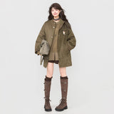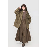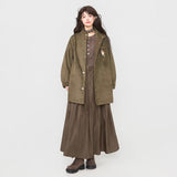 森の中の静けさやヴィンテージハンティングジャケットの面影を思わせる、落ち着きと物語性を併せ持ったジャケット。深みのあるオリーブブラウンと、ゆったりとしたオーバーシルエットが印象的。スウェードライクな質感で、スタンドにもなる程よい高さの襟元やスナップボタン仕様のフロントがさりげない無骨さを醸し出しています。袖口や見返し、肩の切り替え部分にあしらわれた細かなチェック柄がさりげないアクセントとなり、クラシカルな温もりを感じさせます。