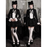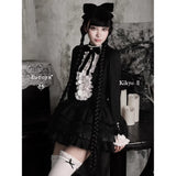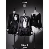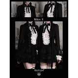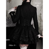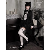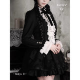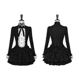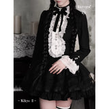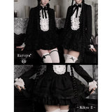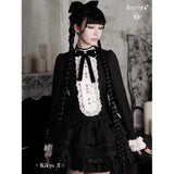 薄暗い洋館の中で静かに佇むゴシックドールを思わせるワンピース。黒を基調とした端正なシルエットに、胸元いっぱいにあしらわれた白いレースフリルと縦に並ぶ装飾ボタンが際立ち、ヴィクトリア時代のアンティークドレスやビスクドールの装いを思わせるクラシカルな雰囲気を纏っています。首元の黒いリボンは、無垢さの中に凛とした気品を添え、どこか物語の中の少女のような存在感を演出しています。段重ねのティアードスカートは軽やかに広がりながらも、透け感のある素材が重なり合うことで、光と影のコントラストを生み出し、耽美で幻想的な印象を強めています。