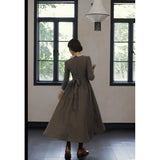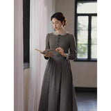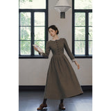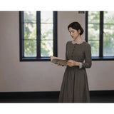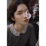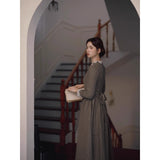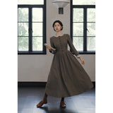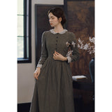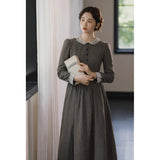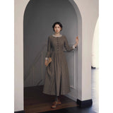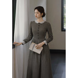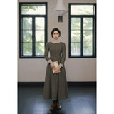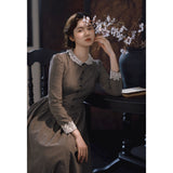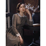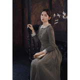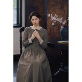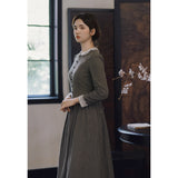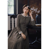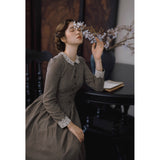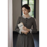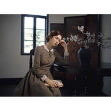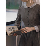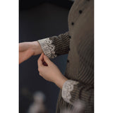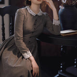 静けさの中に知性と優雅さが漂うクラシカルワンピース。細やかなストライプ柄が縦のラインを強調し、レースの襟とカフスが上品な清楚さを添えています。控えめなボタンとフィットしたウエストラインが、アンティークの物語に登場する女教師や文芸のヒロインを思わせる佇まい。懐かしさと端正さが溶け合った、ノスタルジック・ヴィクトリアンな一着。