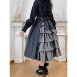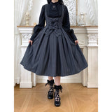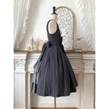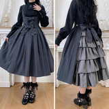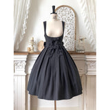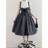 ヴィクトリアン調の上品な雰囲気を漂わせるストライプ柄のジャンパースカート。フロントには大きなリボンをあしらい、裾まで広がるボックスプリーツが優雅な立体感を生み出しています。背面には編み上げと段々のフリルを重ね、ドラマティックで重厚なシルエットを演出しています。