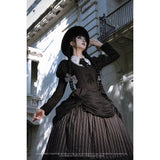 古い学園の物語を想起させるダークアカデミアをテーマとしたトップスとスカート。トップスは、白い襟元をのぞかせた黒の構築的なデザインに、繊細なレースと刺繍が静かに沈み込むように施されています。胸元の装飾は古い紋章のように重厚で、細く絞られたウエストから広がるペプラムが、知性の奥に潜む気高さと緊張感を描き出しています。スカートは、細やかなストライプが走る深い色調の生地に、たゆたうようなドレープが重ねられた一着。裾へと広がるフォルムはクラシカルでありながら、どこか退廃的な美しさを漂わせます。