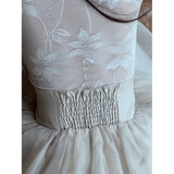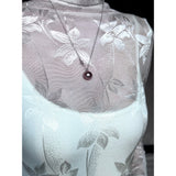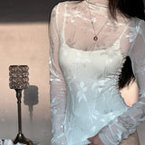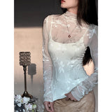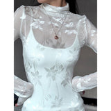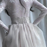 純潔を意味する百合の花を織り込んだハイネックなスリムトップス。咲き誇る華麗な花たちは、今を盛りとばかりに美しく花を咲かせています。シアーなチュールに、ほのかな光沢を帯びた百合の花が浮かび上がり、首元まで静かに沿うハイネックと長い袖が、儚くも凛とした佇まいを醸し出しています。