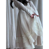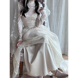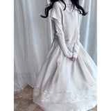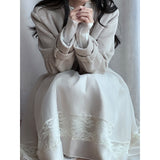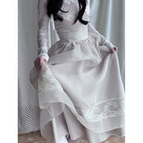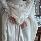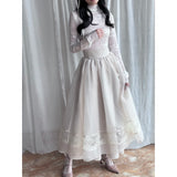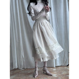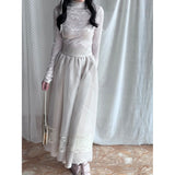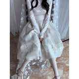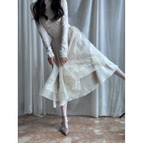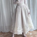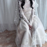 純潔を意味する百合の花の蔦を織り込んだレーススカート。柔らかなアイボリーのオーガンジーが幾層にも重なり、歩くたびに空気を含んで静かに揺れます。裾にあしらわれた繊細なレースが淡い陰影を描きながら、ウエストのすっきりとした切り替えから優雅に広がって、静謐で夢見るような余韻を纏わせます。