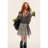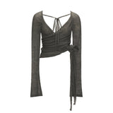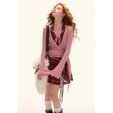空気のように軽やかで、包み込むような繊細さを纏ったニットトップス。柔らかな透け感と華奢なリボンが生み出すフェミニンなラインは、まるで詩的な余韻を残すよう。胸元からウエストにかけてのラップデザインが女性らしい曲線を描き、結び方次第で印象を自在に変化させます。ピンクは甘く儚い夢の色、グレーは知的で静かな艶を宿しています。