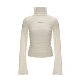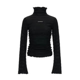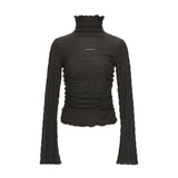 繊細なプリーツと柔らかく波打つテクスチャが特徴的なハイネックなスリムトップス。身体に寄り添うフィット感と、ほのかな陰影がエレガントな印象を与えます。長めのスリーブやメロウな裾が動くたびに揺れ、静かな女性らしさを漂わせます。ブラックとグレーは知的でモードに、ホワイトは儚くピュアに。一枚でもレイヤードでも着こなしが完成します。