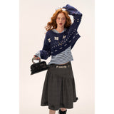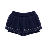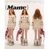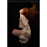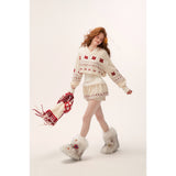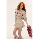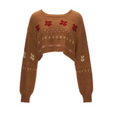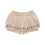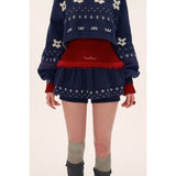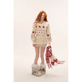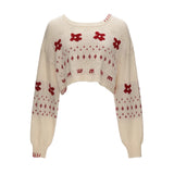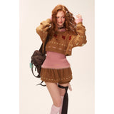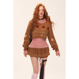 ロマンティックなムードを纏ったニットセータとショートパンツ。ノルディック調の花柄や幾何学模様があしらわれ、どこか懐かしくも愛らしい印象を放ちます。セーターはショート丈でボリュームのある袖が特徴的。ショートパンツは裾のフリルニットがスカートのように揺れ、レイヤードのような立体感を演出しています。温もりと遊び心を兼ね備えた、冬の日常を特別にするガーリーなニットスタイル。