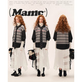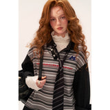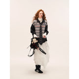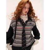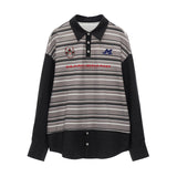 トラッドとストリートを掛け合わせたようなデザインが印象的なストライプ柄のポロトップス。ラガーシャツのような配色ボーダーに、胸元のエンブレムとロゴプリントがアクセントを添え、どこかスクールムードを漂わせます。ゆったりとしたシルエットに対して、シャツ襟やカフスがきちんと感を与え、ルーズさと上品さが絶妙に共存。一枚でプレッピーにも、レイヤードでモードにも着こなせる、自由で知的な印象のアイテム。