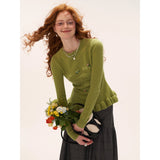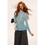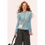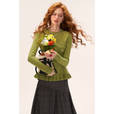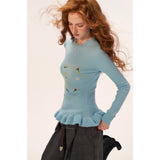 繊細な花の刺繍が散りばめられたフェミニンなニットセーター。ウエストにかけてやや絞られたシルエットと、裾のフリルリブが柔らかく体のラインを引き立てます。淡いパステルトーンが軽やかで、爽やかな空気を纏うような優しい印象に。可憐さと上品さが共存する、クラシカルガーリーなセーター。