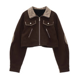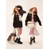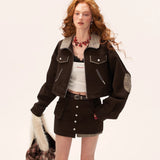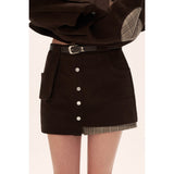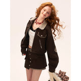 ダークブラウンの生地に、ベージュのチェック柄が襟元や袖を静かに縁取るショートジャケットとショート丈のスカートパンツ。ジャケットは、ドロップショルダーの緩やかな曲線が着る人を優しく包み込み、クラシカルな佇まいの中に都会的なリズムを刻んでいます。スカートパンツは、フロントに並ぶシルバーボタンが宝石のように輝き、裾から覗くチェック柄が秘密を明かすように姿を現す、遊び心溢れるレイヤードデザイン。