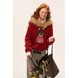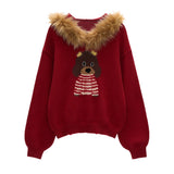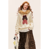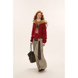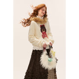 ふんわりとした温もりに包まれるような、愛らしい雰囲気のスウェット。やわらかなニットの身頃はゆったりとしたシルエットで、首まわりにはふかふかのフェイクファーが贅沢にあしらわれ、まるで冬の物語に登場する少女のような可憐さを与えています。胸元には赤いボーダーのお洋服を着た、つぶらな瞳の犬が立体的に編み込まれており、そのほのぼのとした雰囲気に頬が緩みます。