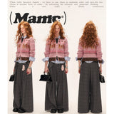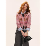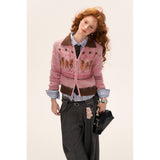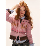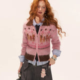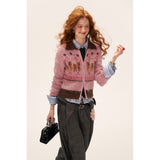やわらかなピンクを基調にしたふんわりモヘア調の編地に、メリーゴーランドが回るような愛らしい馬たちの模様が並んだニットカーディガン。胸元から裾にかけて連なる馬たちと小さなハートのモチーフが、ノスタルジックで心温まる世界観をつくり出し、襟や裾、袖口に配されたブラウンの切り替えが甘さに落ち着きを添えています。着るだけでメルヘンチックな可愛らしさが薫ります。