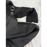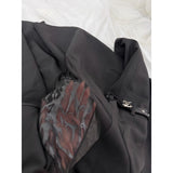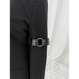 退廃的な美学を纏うゴシックジャケット。フロントは構築的なダブルブレストな仕様。スリーブにはレザーのバックル装飾が施され、無機質な硬質感を演出しています。一方、背面は一転して妖艶なデザイン。透け感のあるメッシュ地に、タトゥー調刺繍が浮かび上がり、背骨に沿って連なるゴシック調の脊椎パーツが視線を奪います。どこか神秘性と背徳感を漂わせる仕上がりとなっています。
