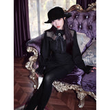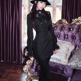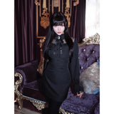 静謐でクラシカル、どこかゴシックな気配を纏ったワンピース。しっとりとした黒の生地が身体に沿って落ちる、端正で影のあるデザイン。透け感を含ませたデコルテとヨーク部分が静かな色香を添え、首元には小さな装飾を留めたリボンが控えめな緊張感を与えています。ウエストは立体的に絞られ、コルセットを思わせる構築的なラインが全体を引き締め、袖はふんわりとしたボリュームから手首に向かって細く収束し、袖口の繊細なフリルがわずかな揺らぎを残します。