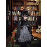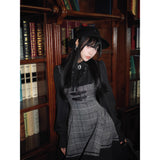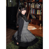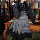 クラシカルでありながらどこか物語性を感じさせる、内省的で端正な美しさを宿したワンピース。グレートーンのチェック生地を基調に、胸元からウエストにかけてコルセットのように切り替えられた構築的なシルエットが印象的。黒の長袖ブラウスと一体化することで静かな緊張感と知性を纏わせ、スカート部分は程よいフレアと裾のプリーツが動くたびに揺れます。