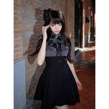 日常の中に溶け込むささやかな物語を大切にする、上品で少しだけ気取った少女の装いを表現したドッキングワンピース。柔らかな黒のスカートは、歩くたびにふわりと広がり、どこか無邪気さを残した可憐な動きを描きます。一方で、上半身の繊細なストライプとレースは、クラシカルな気品をそっと纏わせています。きゅっと引き締まったウエストラインは、少女らしさの中にほんの少しの大人びた輪郭を与えます。