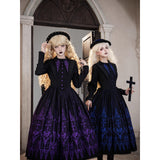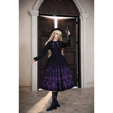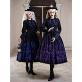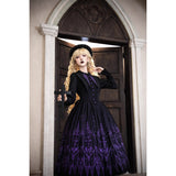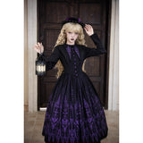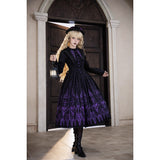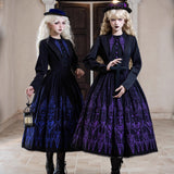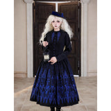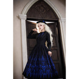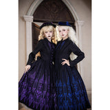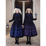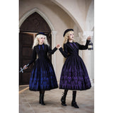 荘厳な礼拝堂の静けさを纏うように、深い黒を基調としたワンピースに、ステンドグラスの尖塔を思わせる緻密なブルーやパープルの刺繍がびっしりと施されたワンピース。胸元にはゴシック建築を象徴するような直線と装飾的なモチーフが立ち上がり、ウエストから広がるたっぷりとしたフレアスカートが神秘的な光を受けて揺れ、まるで夜の聖域に佇む守護者のような存在感を放ちます。