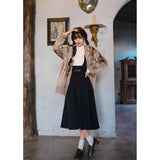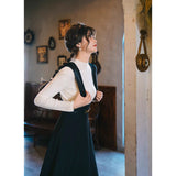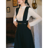 深いブラックカラーが落ち着きと洗練された雰囲気を醸し出しているジャンパースカート。ウエスト位置が高く、美しいシルエットとなるように緻密に計算されたエレガントなアイテム。流行に左右されない永遠の憧れスタイル。