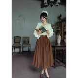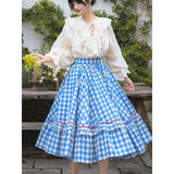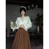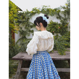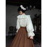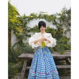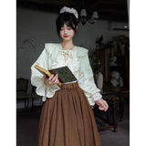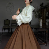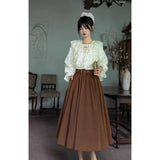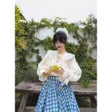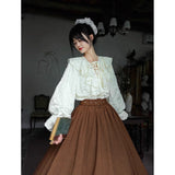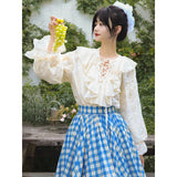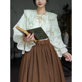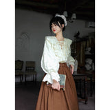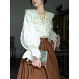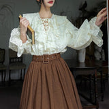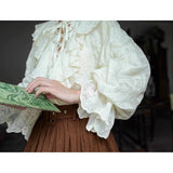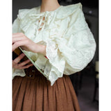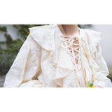繊細なレース生地に蝶々や花々の刺繍が施された、ヴィンテージロマンティックな雰囲気のレースアップブラウス。まるで物語のヒロインが纏っているみたい。胸元にはフリルが幾重にも重なり、編み上げのデザインがアクセントとなっており、クラシカルで華やかな印象を与えます。袖口もレースのスカラップ仕立てで広がり、優雅で可憐なシルエットを描いています。