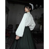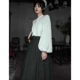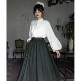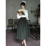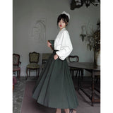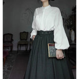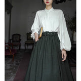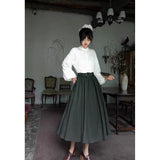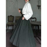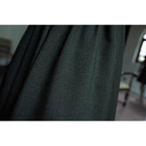 落ち着いた雰囲気を漂わせる、クラシカルなグレーグリーンのアンブレラスカート。ウエストには存在感のあるベルトがあしらわれ、上品さとレトロ感を引き立てています。生地には薄手のツイードに似た、繊細な織り感のある素材を使用しています。たっぷりとしたギャザーが生み出す美しいドレープが歩くたびに優雅に揺れ、知的でノスタルジックな印象を与えます。