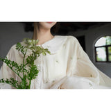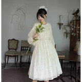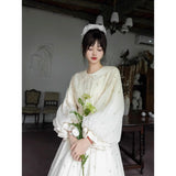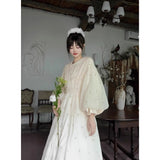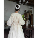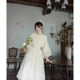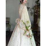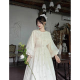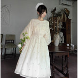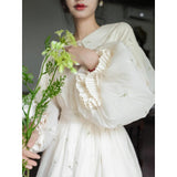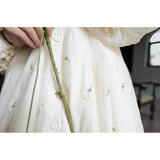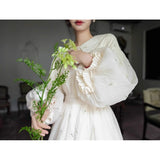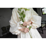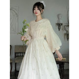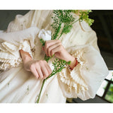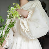 朝霧に包まれた空から射す陽光を浴びて、そよ風に揺れる花々を刺繍したワンピース。たっぷりとしたギャザーとふんわり広がるシルエットが優雅な存在感を演出してくれる。袖口にはプリーツを重ねたボリュームスリーブがあしらわれ、繊細でロマンティックな印象をさらに引き立てています。どこか物語の中のヒロインを思わせる、上品で夢見心地なアイテム。