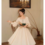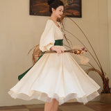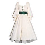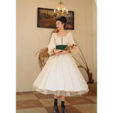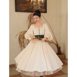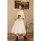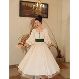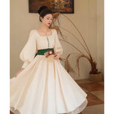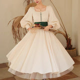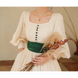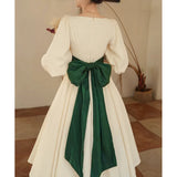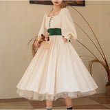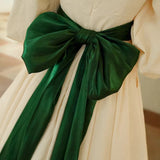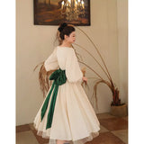 1950年代の優雅さは、今なお色褪せることなく、息をのむほどに美しい。月夜の舞踏会に誘われたお嬢様みたいに演出してくれるワンピース。スクエアネックの端正な佇まいと、ふんわりと膨らむ七分袖が穏やかな気品を醸し出しています。胸元に並ぶ小さなボタンが縦の線を静かに強調し、ウエストには深いグリーンのリボンが結ばれて後ろ姿にまで、華麗な余韻を残します。