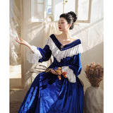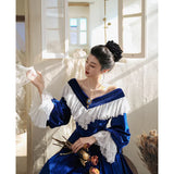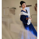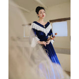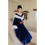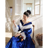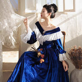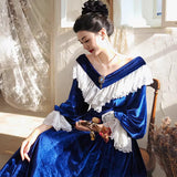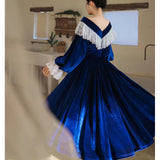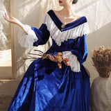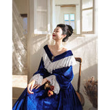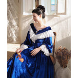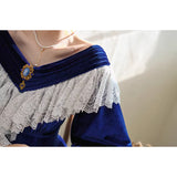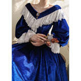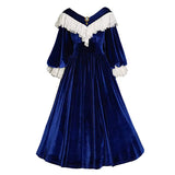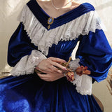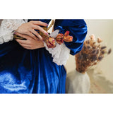 古典絵画の一場面のような、気品あるコントラストを描き出すベルベットワンピース。重く、深みのあるベルベットは、憂いを帯びた古典的なオペラの主題歌のよう。デコルテを縁取る白いレースの大きな襟が、月明かりを受けた波のように胸元に重なり合っています。長い袖口にも同じレースが施されており、ウエストからたっぷりと落ちるスカートは重みのある生地ならではの品格を保ちながら、歩くたびに静かに揺れます。クラシカルでありながらもどこか詩的な余韻を残す、夜のサロンに佇むための一着。