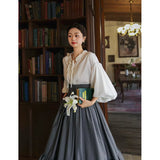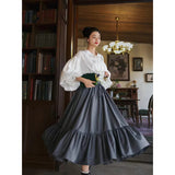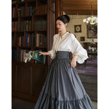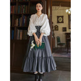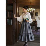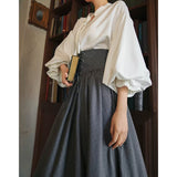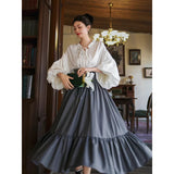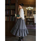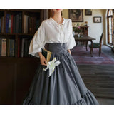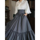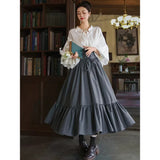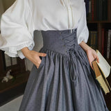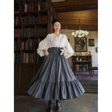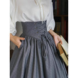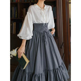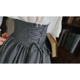 古い書斎の窓辺で本を片手に静かな時間を過ごす少女の、知的でロマンティックな雰囲気をそのまま纏うような、クラシカルで物語性のあるコルセットスカート。深みのあるグレイの生地は、長い年月を重ねた書物の装丁や古い木製の書棚の色合いを思わせ、落ち着いたクラシカルな雰囲気を漂わせています。ハイウエストのコルセット部分は、細かなレースアップによって美しいシルエットを描き、かつての貴族の装いを思わせる端正な気品を感じさせます。スカート全体に広がる細かなドットは、古い紙に浮かぶインクの粒や、夜の書斎に漂う静かな空気のように控えめ。裾に向かってふんわりと広がるティアードシルエットは、歩くたびにゆるやかな波のように揺れ、まるで古い物語のページがそっとめくられていくかのような優雅な動きを描きます。