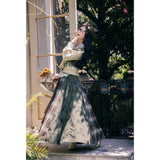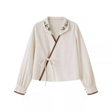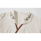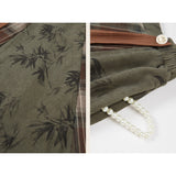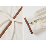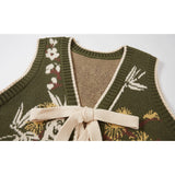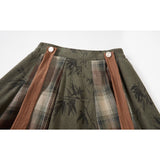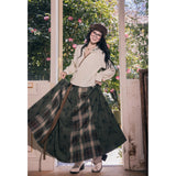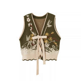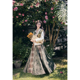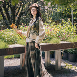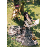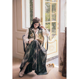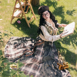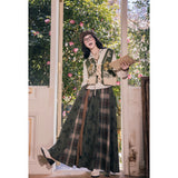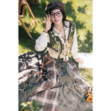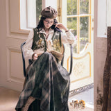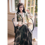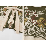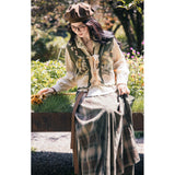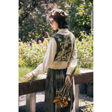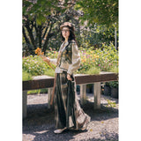 文学の香りを纏うようなお洋服。ベストは、松竹梅の緻密な文様が織り込まれたノスタルジックなジャカード編み。フロントのリボン結びが柔らかさを添え、どこか牧歌的な温もりを感じさせます。ブラウスは、和のエッセンスを感じるカシュクールデザイン。襟元に施された繊細な植物刺繍が、静かな上品さを引き立てます。スカートは、竹の模様とブラウンチェックを組み合わせたロングフレア。和とクラシカルが調和した独特の世界観を作り出しています。