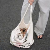 猫たちと過ごす気ままな日常や、何気ない瞬間に描き留めた落書きのような物語を描いたキャンバスバッグ。やわらかなアイボリーの生地の上には、さまざまな表情の猫たちが気まぐれに佇み、手書きの文字やラフなイラストが重なり合って、まるで誰かがノートの余白に思いつくまま描いた小さな世界のように広がっています。少しユーモラスで自由なタッチのイラストは、猫の気まぐれな性格や、人のいないところでこっそりと過ごす静かな時間を思わせます。