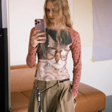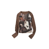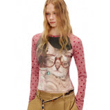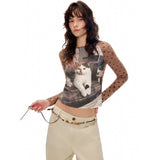 家の中で静かにくつろぐ猫と、穏やかな日常のひとときを映し取ったスリムトップス。トップスのフロントには、椅子の上でゆったりとくつろぐ猫や、大きな眼鏡をかけた猫の姿が大きく描かれており、まるで本を読んだり、部屋の中でのんびり過ごすような知的でユーモラスな雰囲気を感じさせます。